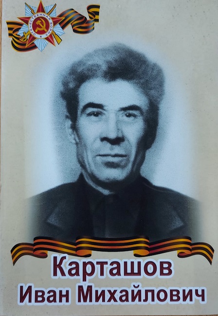 Карташов Иван Михайлович. Родился в 1925 г. Когда началась война, ему было 16 лет, поэтому до 1943 года на фронт его не брали. И только 1 января 1943 года он был призван Задонским райвоенкоматом в действующую армию. Всю войну прослужил поваром. Гвардии младший сержант. Служил в 355 гвардейском стрелковом полку 106 гвардейской стрелковой дивизии. Награждён медалями За отвагу, За взятие Вены, За победу над Германией. Отец председателя УИК 17-05 Полуниной Татьяны Ивановны.