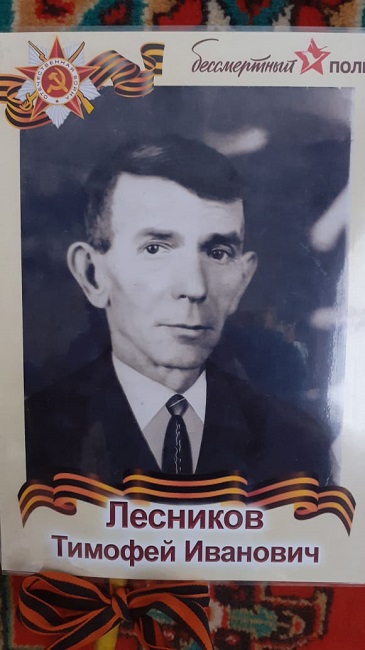 Лесников Тимофей Иванович. Родился в июне 1904 г. в с. Большая Поляна Большеполянского района Курской области. 18 июля 1941 г. ушел на войну. Служил пулеметчиком в 563-м стрелковом полку. При обороне Севастополя получил тяжелое ранение. Участвовал в освобождении стран Прибалтики, дошел до Кенигсберга. Награжден Орденом Краской Звезды; медалями За отвагу, За оборону Севастополя, За взятие Кенигсберга. Умер в 1981 г. Дедушка председателя УИК 17-03 Разинковой Людмилы Алексеевны.