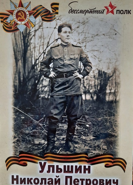 Ульшин Николай Петрович. Родился в 1924 г. в Курской области Большеполянском районе селе Бурдино. В 1942 г. был призван на фронт. Красноармеец. Служил в рядах 63-й армии в составе 41-й стрелковой Краснознамённой ордена Кутузова дивизии. Его служба была отмечена медалью «За боевые заслуги». Во время войны стал сотрудником контрразведки СМЕРШ. Был награжден медалями «За отвагу», «За победу над Германией в Великой Отечественной войне 1941–1945 гг.». Дошел до Берлина и был свидетелем, как советские солдаты водрузили Знамя Победы над Рейхстагом. Умер в 2002 году. Папа председателя УИК 17-22 Карповой Ирины Николаевны.