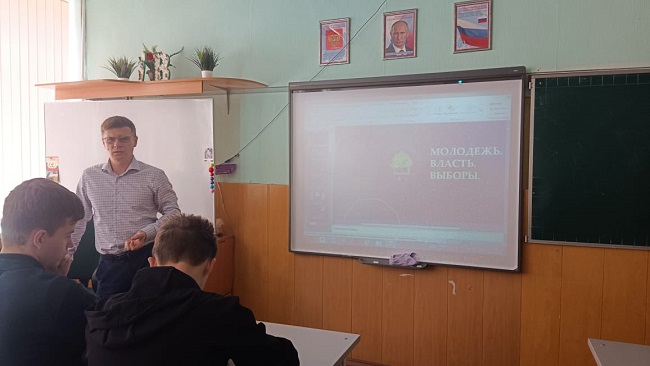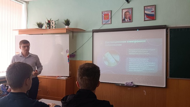Председатель ТИК Тербунского района провел в школе села Тербуны экскурсию "Молодежь. Власть. Выборы." Присутствующие ученики 9А класса узнали о дистанционном электронном голосовании - ДЭГ и других важных составляющих выборной кампании. Участники занятия пришли к выводу, что выборы – основной институт демократического государства и от их результатов зависит жизнь всего общества и каждого гражданина в отдельности.